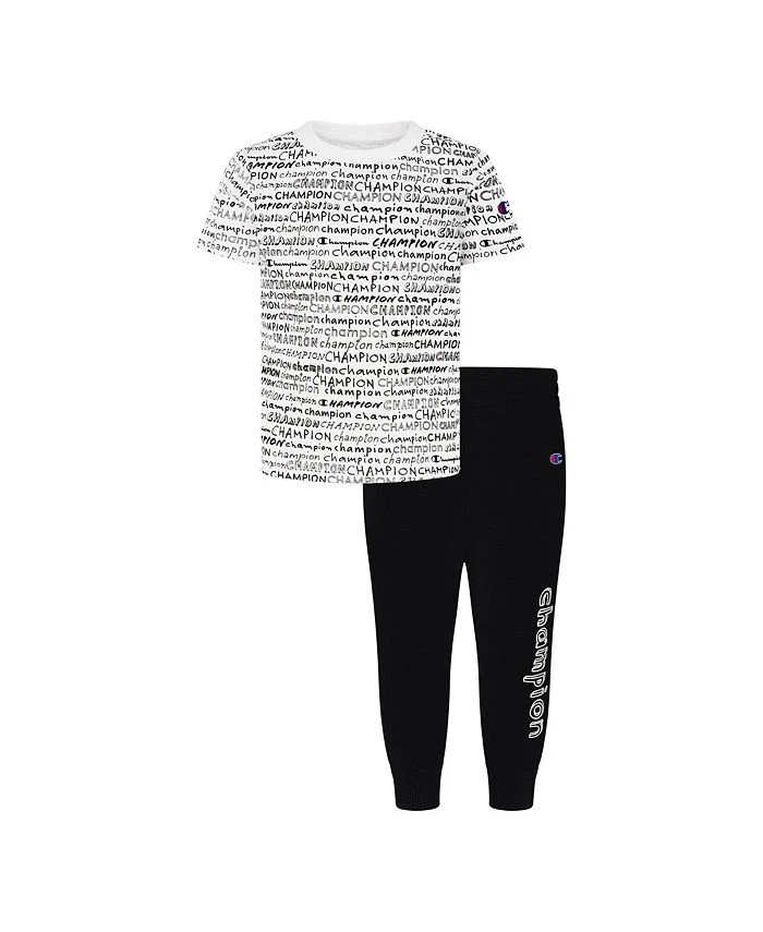 Grab your little Champion and get them in this Champion hand drawn graphic set. The set includes the brands hand drawn short sleeves cotton blend T-shirt and coordinating fleece joggers with hand drawn script. Perfect for any occasion.